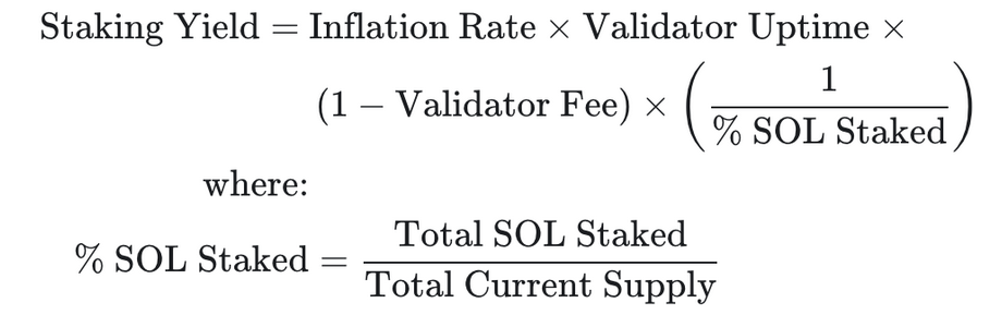 Please note that this is an idealized Staked Yield as it neglects validator uptime impact on rewards, validator commissions, potential yield throttling and potential slashing incidents. It additionally ignores that % of Staked SOL is dynamic by design, i.e. it is expected that the % of staked SOL changes over time thus impacting the staking yield over time. It is only presented to be used as a rough estimate for expected staking yields.