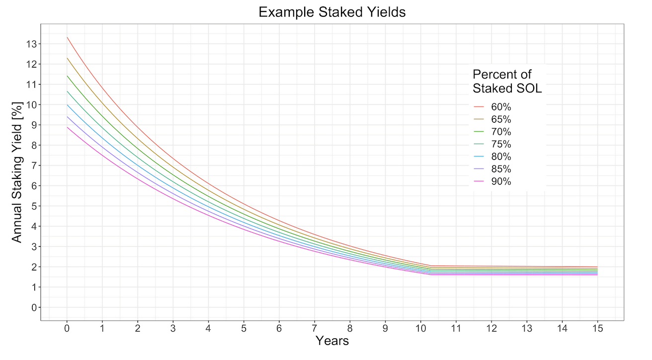 The amount of total SOL that will be staked is unknown, so we can only estimate the exact staking yields. Below, we show staking yields over time segmented by different values of the percent of staked SOL that might be observed on the network (between 60-90%). The inflation schedule parameters are set as described above.